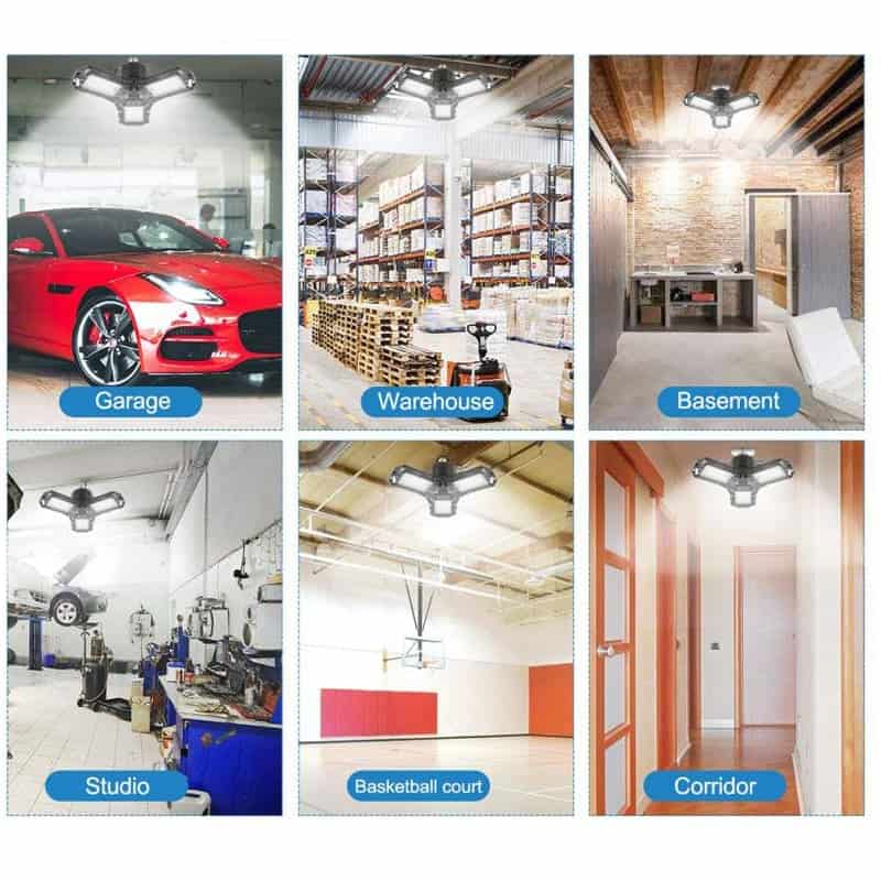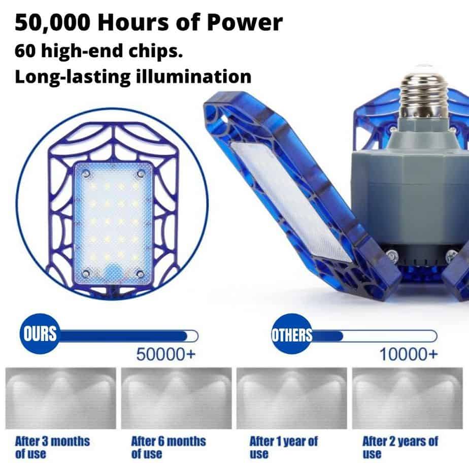This bright LED garage light features three adjustable bulb heads that deliver 50,000 hours of brightness where you need it. Energy-saving, low consumption, and low-heat generating, the power of ultra-strong LED means less money out of your pocket for electricity.